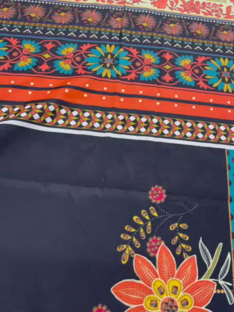 Step into timeless elegance with this stunning midnight black 3-piece suit, adorned with rich ethnic-inspired prints and vibrant accent tones. The shirt features intricate multicolor motifs arranged in vertical panels, creating a flattering and graceful silhouette. The detailed borders and traditional patterns add depth and a luxurious finish to the design.