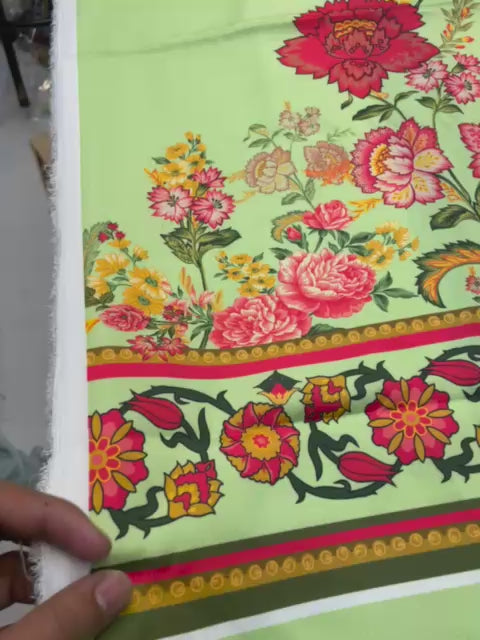 Refresh your wardrobe with this graceful mint green 2-piece suit, adorned with delicate floral prints that bring timeless elegance to everyday wear. The shirt features beautifully arranged floral motifs with contrast borders that enhance the overall silhouette, while the tassel-accented neckline adds a subtle traditional touch.