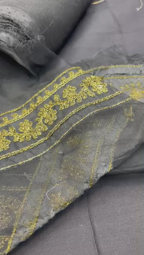 Sophisticated and elegant, this unstitched 3-piece suit is crafted from premium lawn fabric. The shirt and trouser feature plain black fabric, beautifully adorned with complete golden copper lace detailing as shown in the picture. Finished with a chiffon dupatta featuring delicate embroidery, this ensemble is perfect for festive occasions and evening wear.